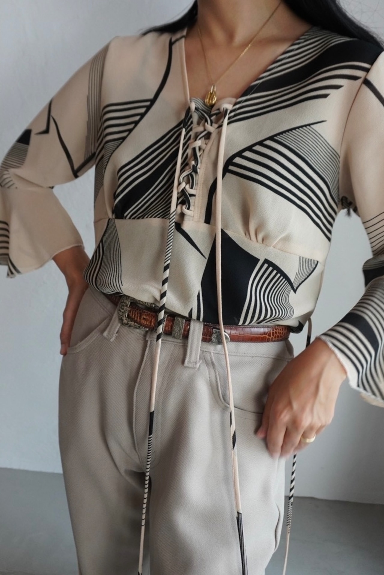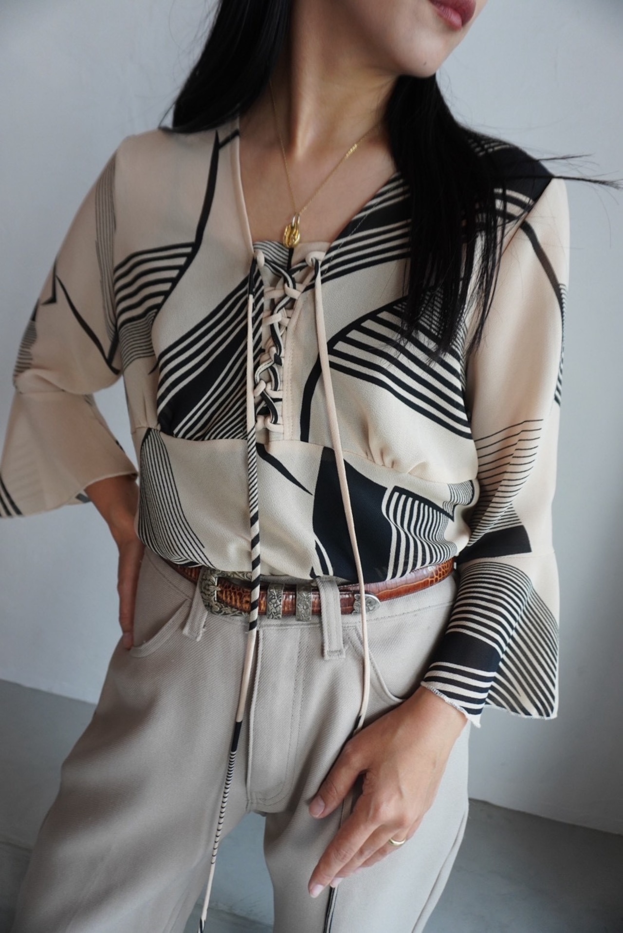 長めの紐はウエストをキュッと絞っても◎