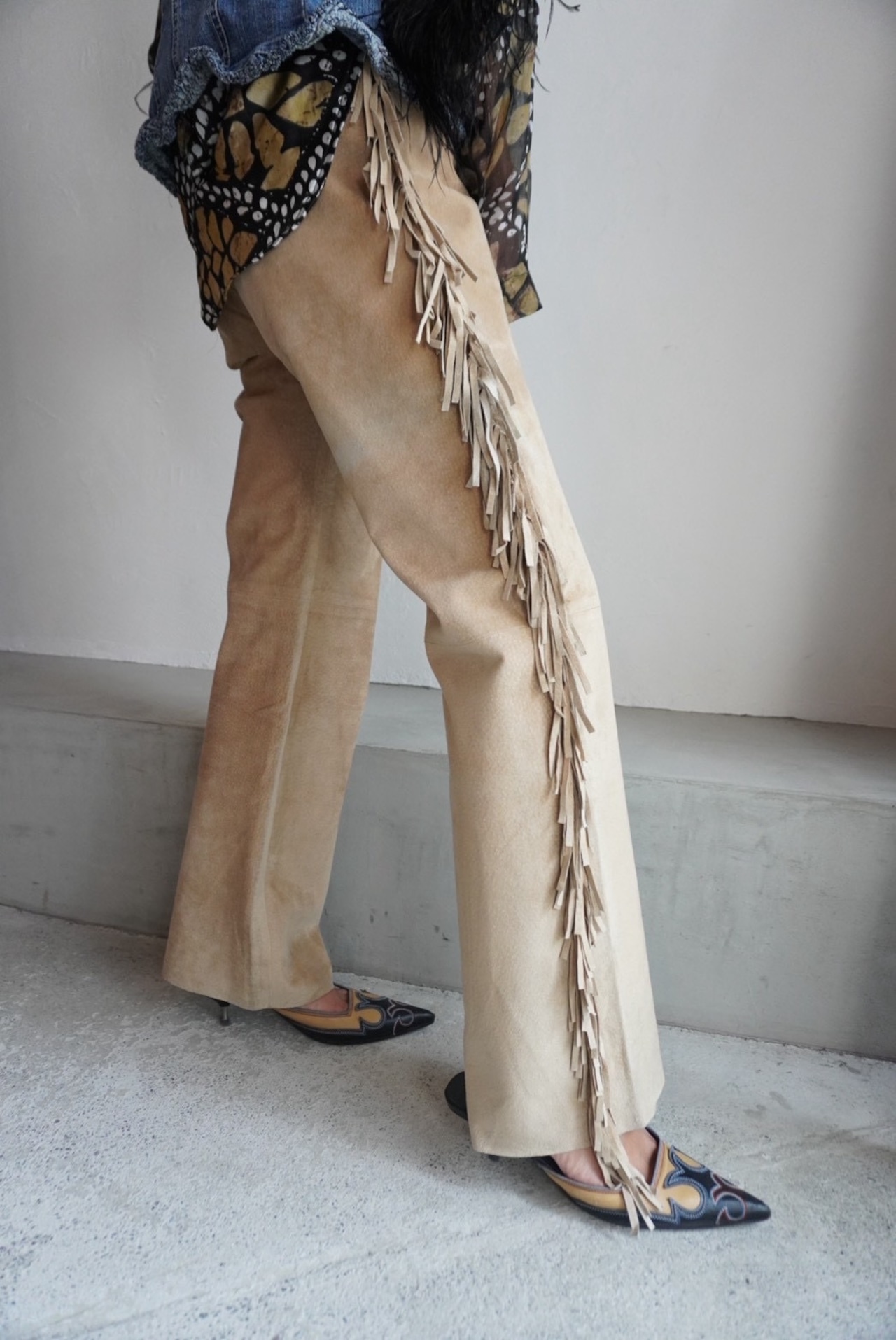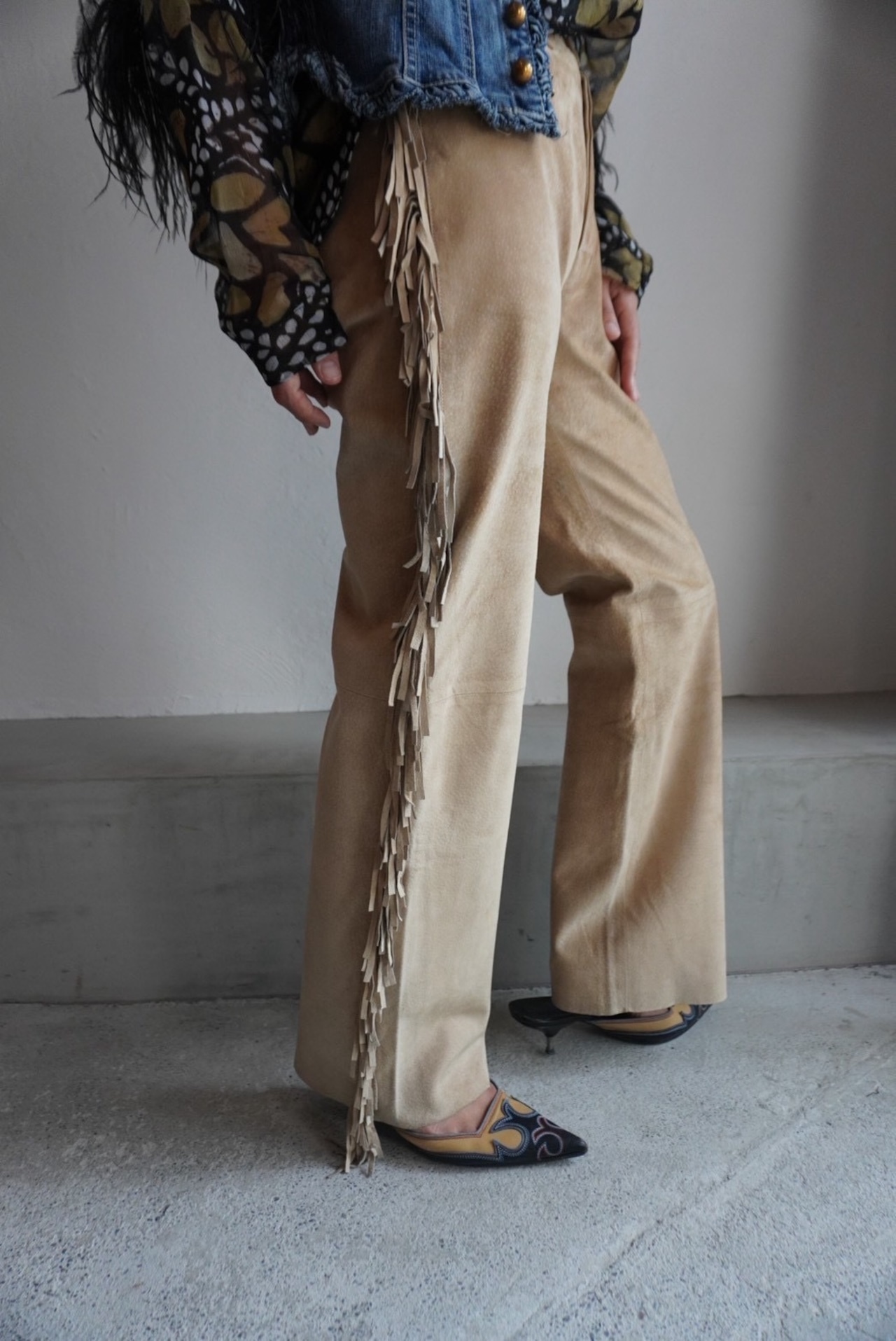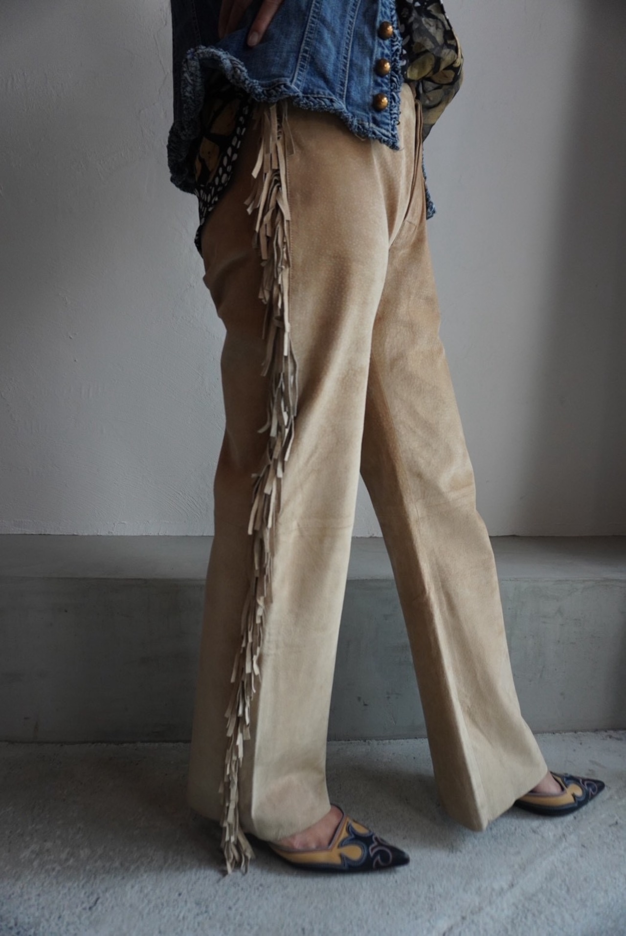 サイドにフリンジがついたデザイン性の高いスエードパンツ。