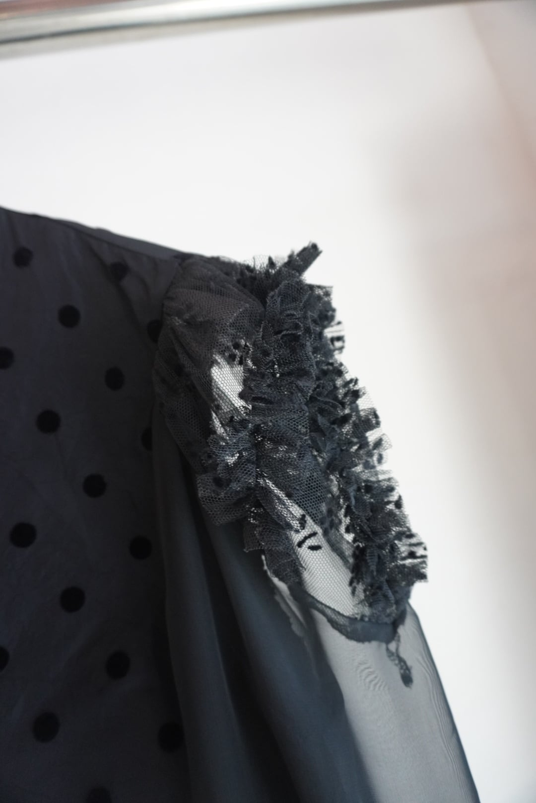 シースルの袖丈、肩のレースのフリル、ドット柄が可愛いショート丈のジャケット。