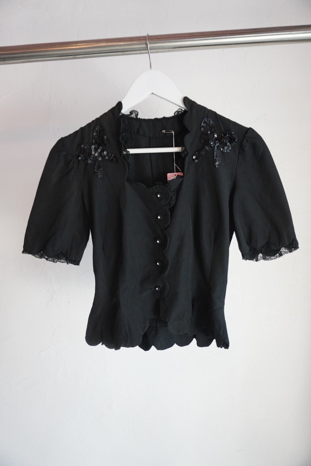 リボンのビジューと裾のレース、スカラップのデザインが可愛い半袖のジャケット。