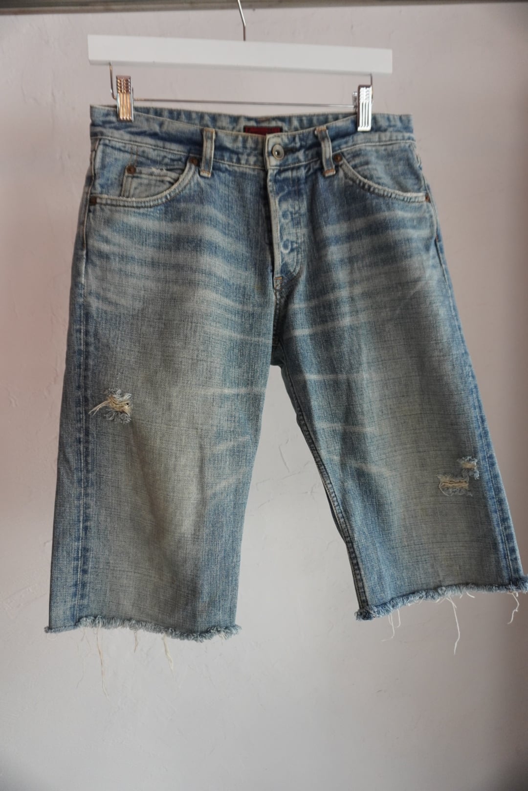 程よいボロさとゆとりがあるサイズのハーフデニムをウエストベルトで絞って履いてます。