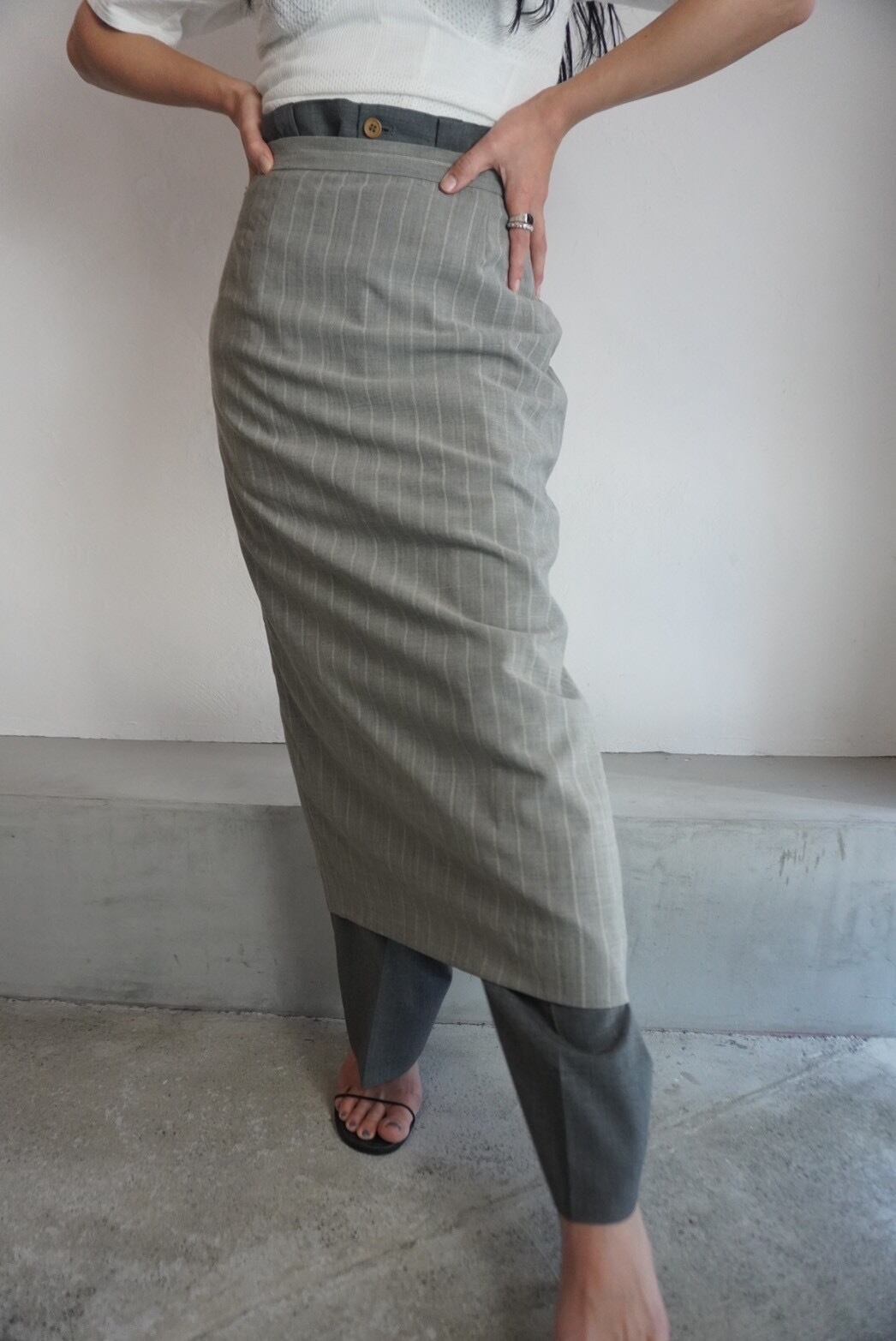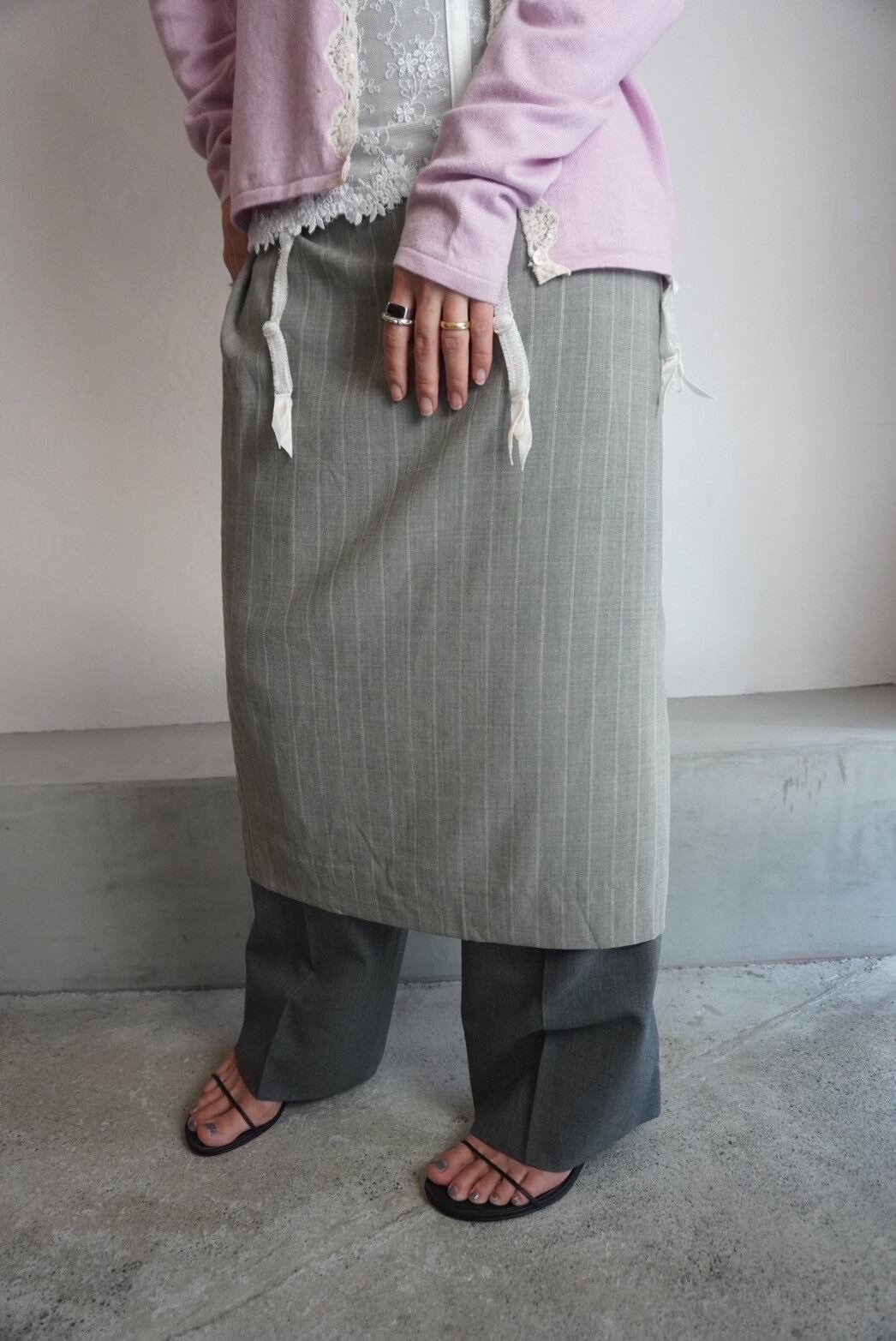パンツをレイヤーしてヒールなどと合わせて履いていただくのも可愛いですし、後ろに大きく入ったスリットで、ブーツのコーディネートも楽しめるアイテムです。